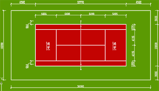 國際網(wǎng)聯(lián)和國家體委頒布的《網(wǎng)球競賽規(guī)則》中規(guī)定,一片標(biāo)準(zhǔn)網(wǎng)球場地的占地面積不小于36.6米(南北長)×18.3(東西寬)米,這一尺寸也是一片標(biāo)準(zhǔn)網(wǎng)球場地四周圍擋網(wǎng)或室內(nèi)建筑內(nèi)墻面的凈尺寸。在這個(gè)面積內(nèi),有效雙打場地的標(biāo)準(zhǔn)尺寸是:23.77米(長)×10.98米(寬),在每條端線后應(yīng)留有余地不小于6.40米,在每條邊線外應(yīng)流有余地不小于3.66米。在球場安裝網(wǎng)柱,兩柱中心測量,柱間距是12.80米,網(wǎng)柱頂端距地面是0.914米。